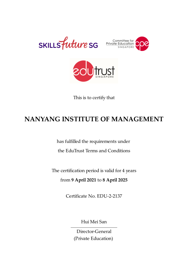 — 2021 荣获由新加坡私立教育理事会 (CPE) 认证的为期4年的新加坡教育信托资质 (EDUTRUST)