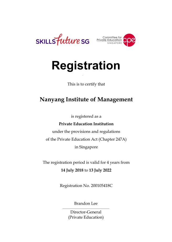 依照新加坡私立教育法案的一部分,南洋需向私立教育理事会(CPE)注册。这表明南洋已经满足了私立教育法案所规定的CPE所规定的学术与运营要求。